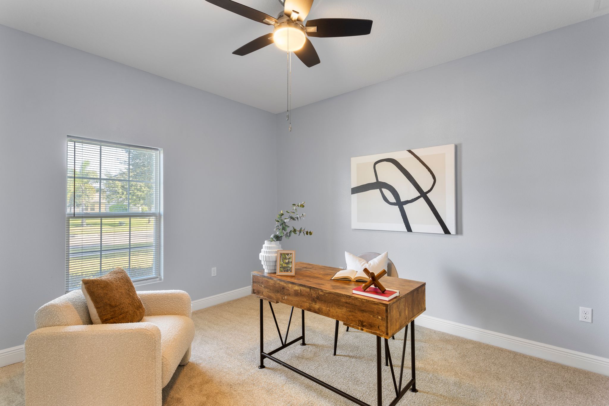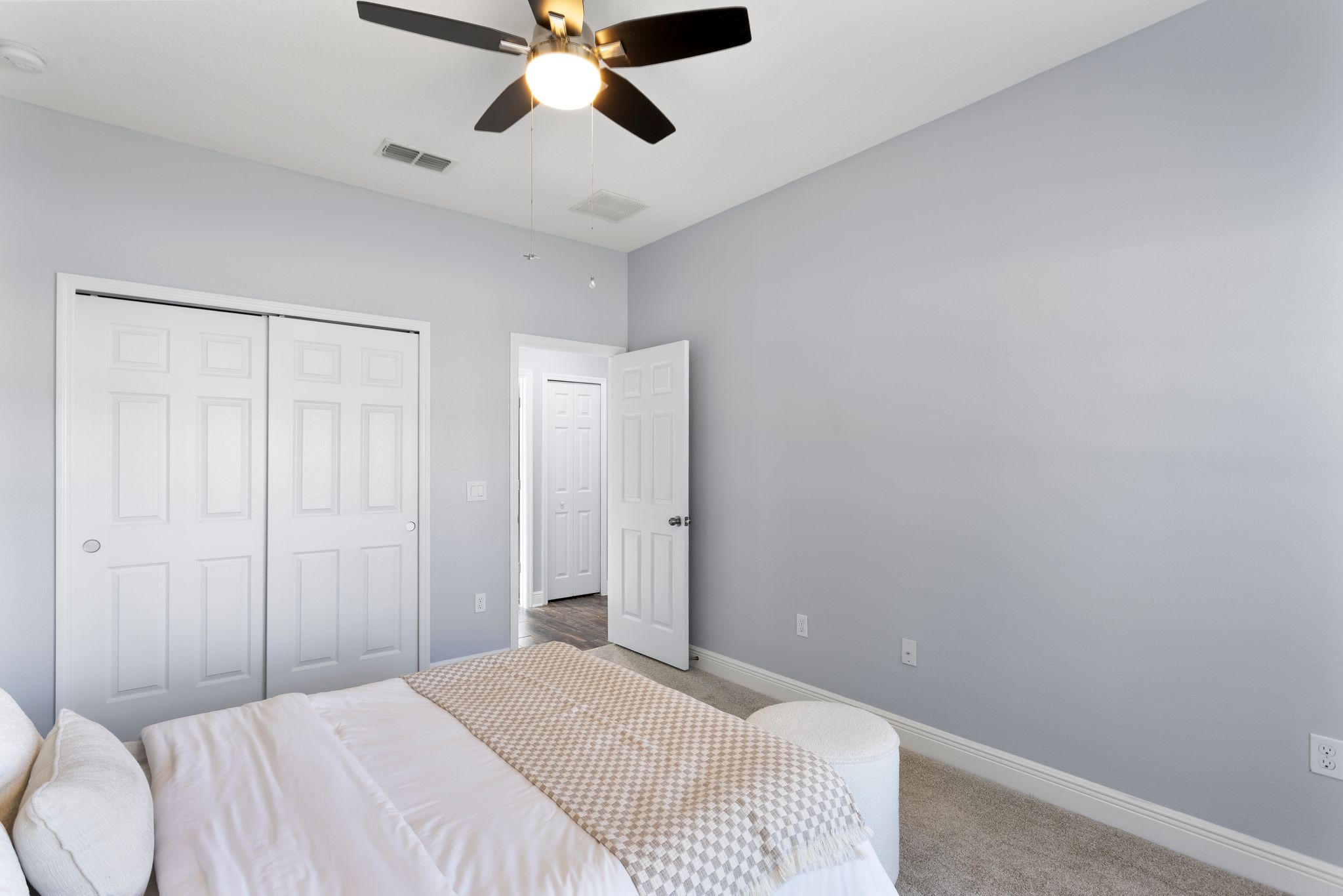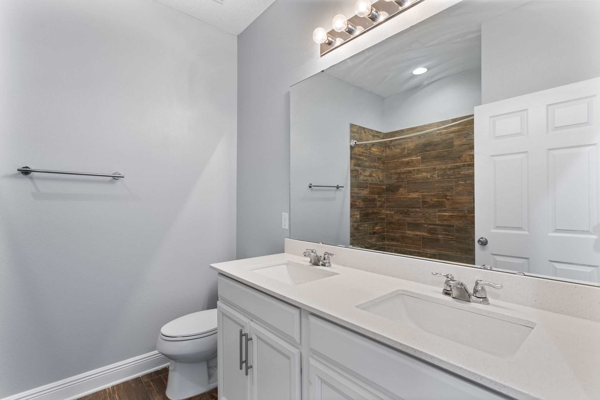 This split-floor plan provides peace and quiet from the main livings areas of the house, as you walk down the hallway to the second and third bedrooms. In the hallway you’ll find the second bathroom, also complete with double sinks and granite countertops matching the primary bedroom and kitchen.